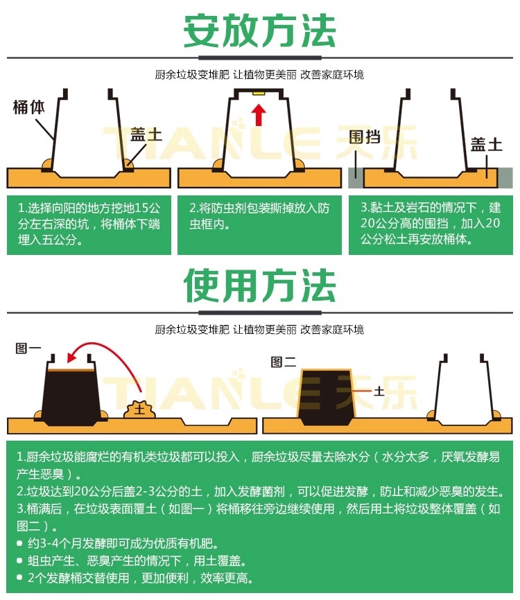 3.桶滿后,在垃圾表面覆土(如圖一)將桶移往旁邊繼續使用,然后用土將垃圾整體覆蓋(如圖二)。約3-4個月發酵即可成為優質有機肥。蛆蟲產生、惡臭產生的情況下,用土覆蓋。2個發酵桶交替使用,更加便利,效率更高。