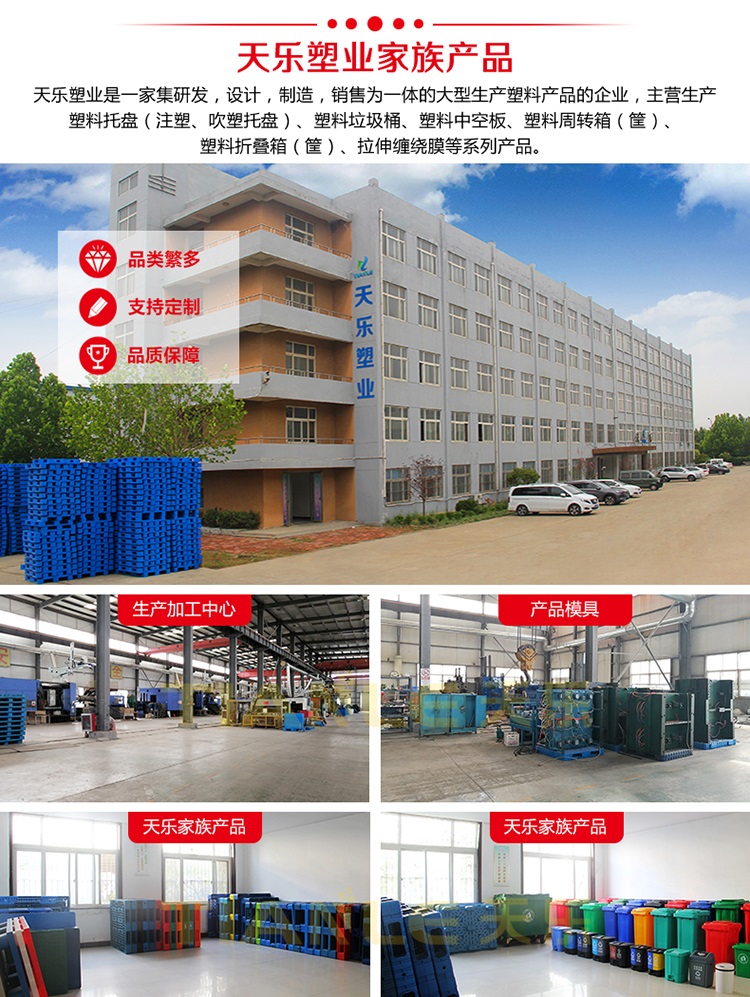主營生產塑料托盤(九腳、雙面吹塑托盤;川字、田字、九腳、雙面注塑托盤)、240L/120L/100L/50L/30L塑料垃圾桶、40L/20L雙胞胎垃圾桶、660L掛車垃圾桶、智能垃圾桶、塑料周轉箱(筐)、塑料折疊箱(筐)、PP中空板、拉伸纏繞膜等系列產品。