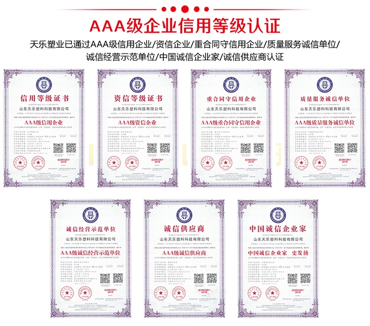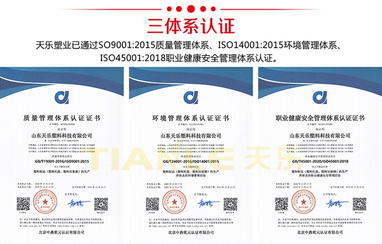 山東天樂塑料科技有限公司是一家集研發,設計,制造,銷售為一體的大型生產塑料產品企業,公司通過ISO質量管理體系、環境管理體系、職業健康安全管理體系認證,AAA企業信用等級認證。公司擁有大型注塑、吹塑成型設備十多臺,擁有經驗豐富的設計研發團隊,支持產品定制服務。